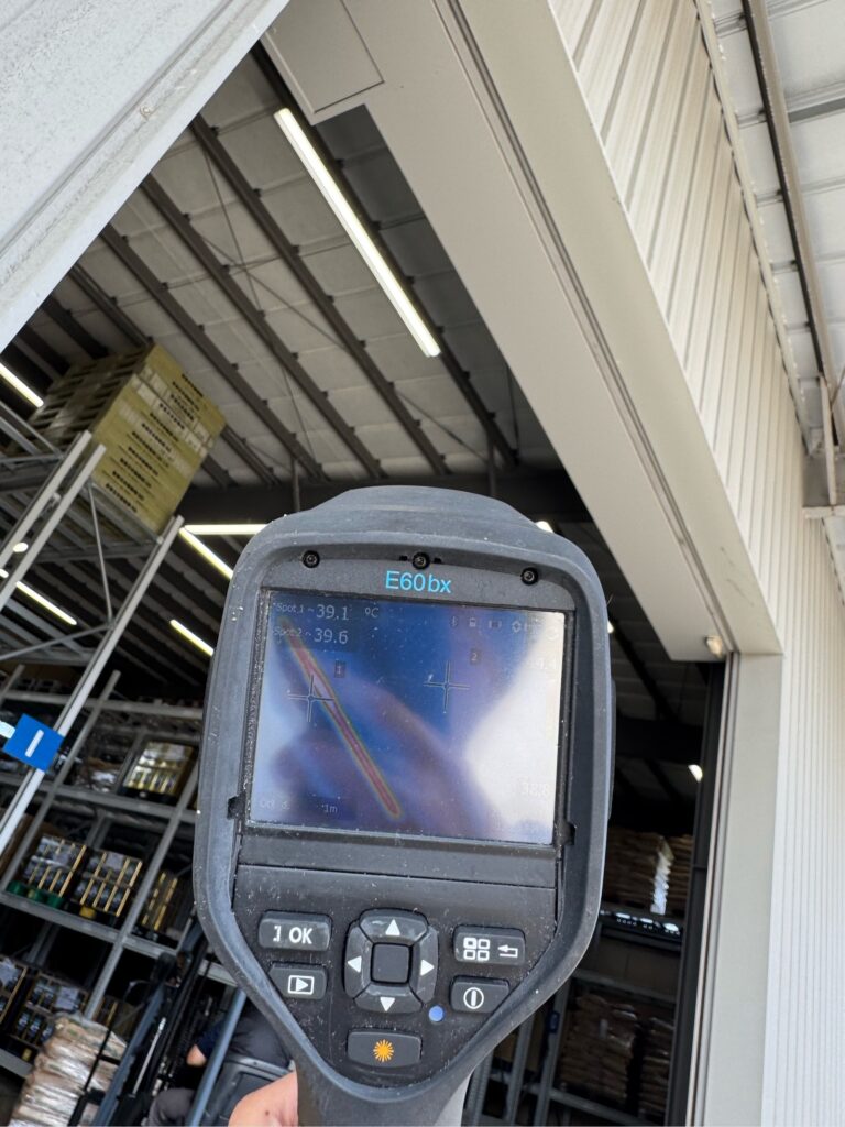 施工後、倉庫上部にあるデータロガーでの温度測定結果として、38度から33度ほどになっていました。